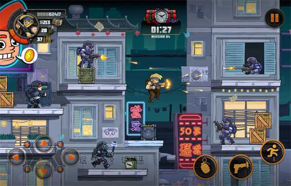 3、进入游戏关卡,通过移动角色,跳跃和攻击,使用不同的枪和手榴弹可以快速的消灭敌人。