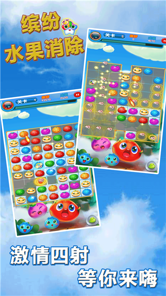 4、缤纷水果消除在这些迷人的淘汰关卡中,每个关卡获得更多分数。