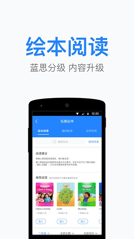 1、推荐练习:随时随地推荐作业练习,灵活选择课内训练、同步练习、绘本、英语口语、配音、试卷。作业练习形式丰富,满足教学需要;