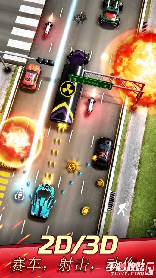 1.加速你的骑行通过许多不同的快车道:射击和粉碎骑着汽车、自行车、卡车、坦克、飞机等的敌人。