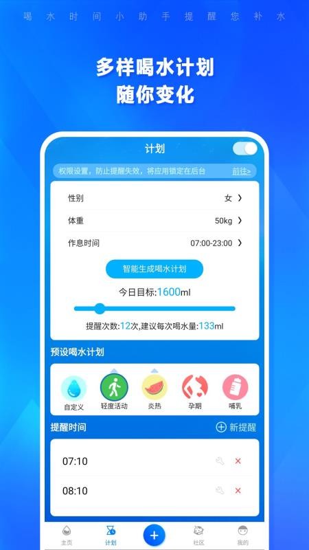 喝水时间作为一款饮水提醒工具,根据性别、