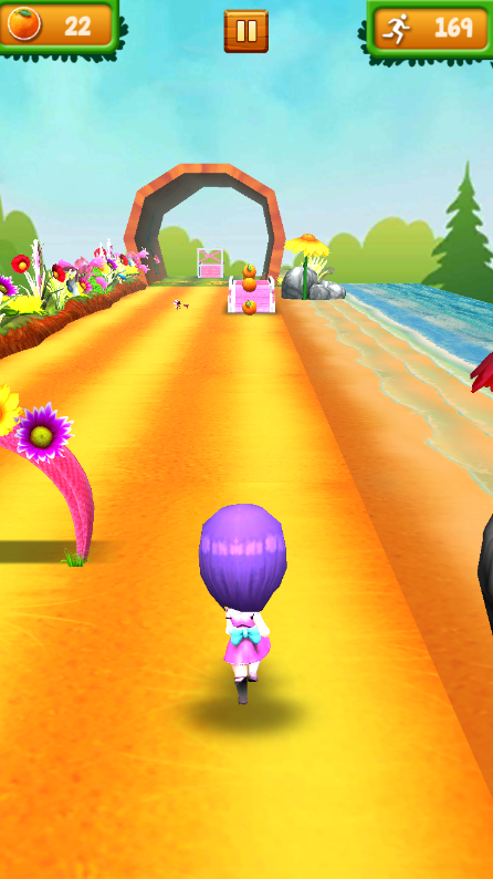 游戏中用户需要控制角色奔跑,避开障碍物,并收集水果,关卡中用户可以一直奔跑下去,收集到足够多的水果!