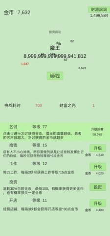 1.用钱砸魔王作为一款养肝护发的放置挂机类型的手游,900亿亿血的魔王来袭,而你要做的就是努力赚金币,赚的金币可以用来干什么?当然是砸魔王了。。。