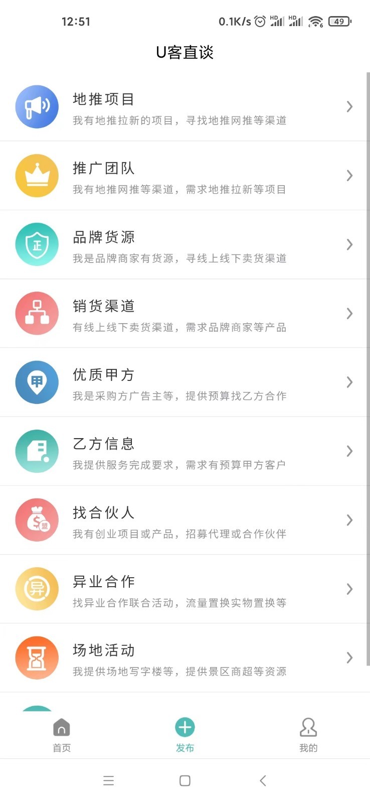 u客直谈作为一款一个非常方便的获客和客户开发平台。您可以在这里发布您的供需合作信息,方便您快速联系合适的甲方或乙方。超全的分类,方便用户找到对应的区域。根据发布时间和真实性过滤信息。