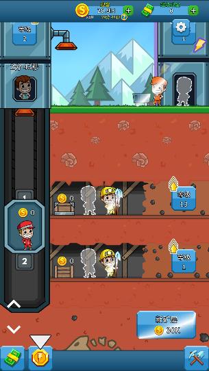 4、电梯运输和地上的运输工需要480个金币才能进行升级,可升级运输速度,运输量,运输工人数等等。在用户们攒够金币后即可开始升级。5、当经理头上出现小锤子的图案时,点击小锤子可以对开采的矿工进行加速,不过只有60秒的加速时间。黄色的矿工的箱子里最多可以装1k的金币,电梯的也是,地上推小车的矿工也同样。