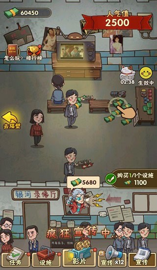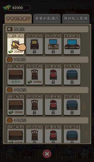 3、赚到足够的钱后,可以升级电视和房间,让你的影院发展越来越好,成为国际化的影院。