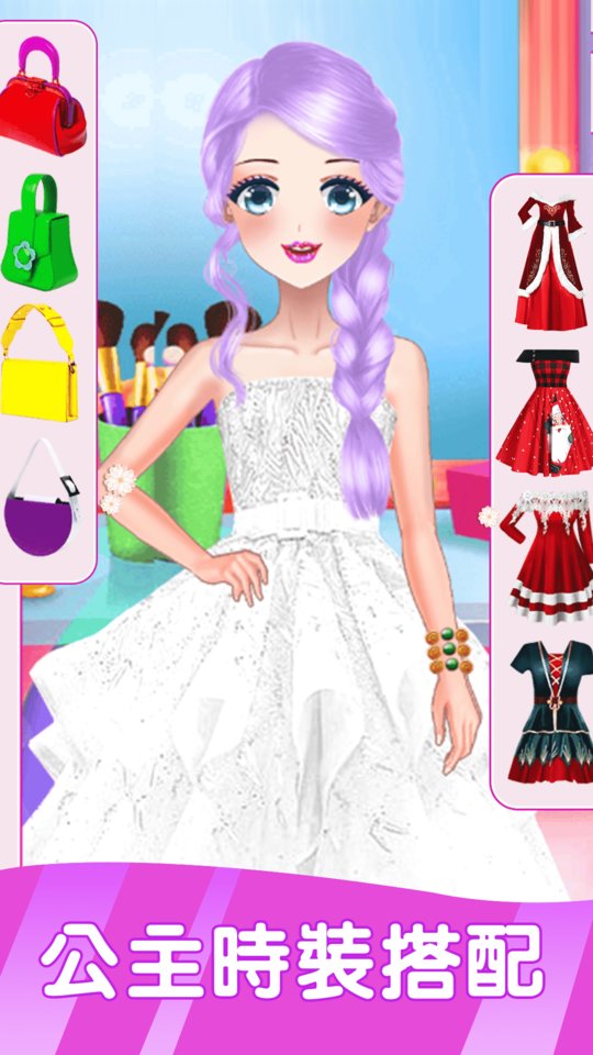 1、你想要为可爱的甜美公主化妆、设计发型、选择裙子、袜子、鞋子、搭配首饰等,把甜美公主打扮得幸福快乐。