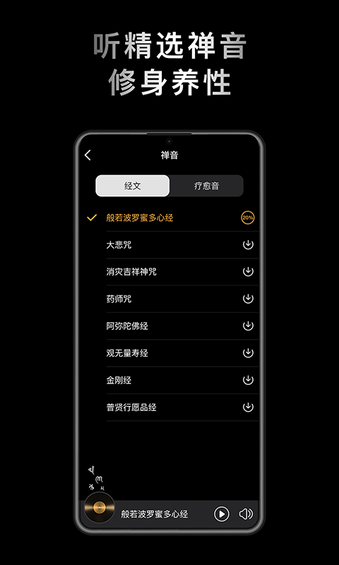 1、本软件可以帮助用户更新身体、修身养性,并可以在线收听精选禅宗音乐。