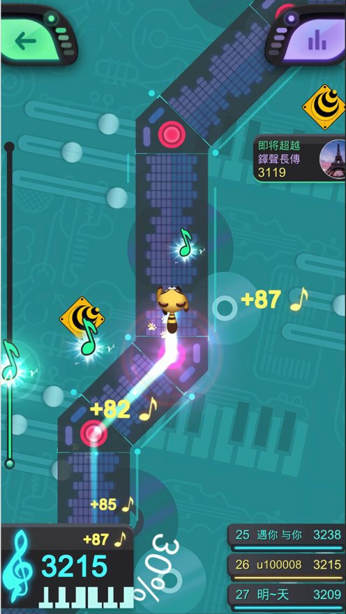 沿途会遇到各种节拍的挑战活动,手指灵活的操作,踩准得分点,获得高分。