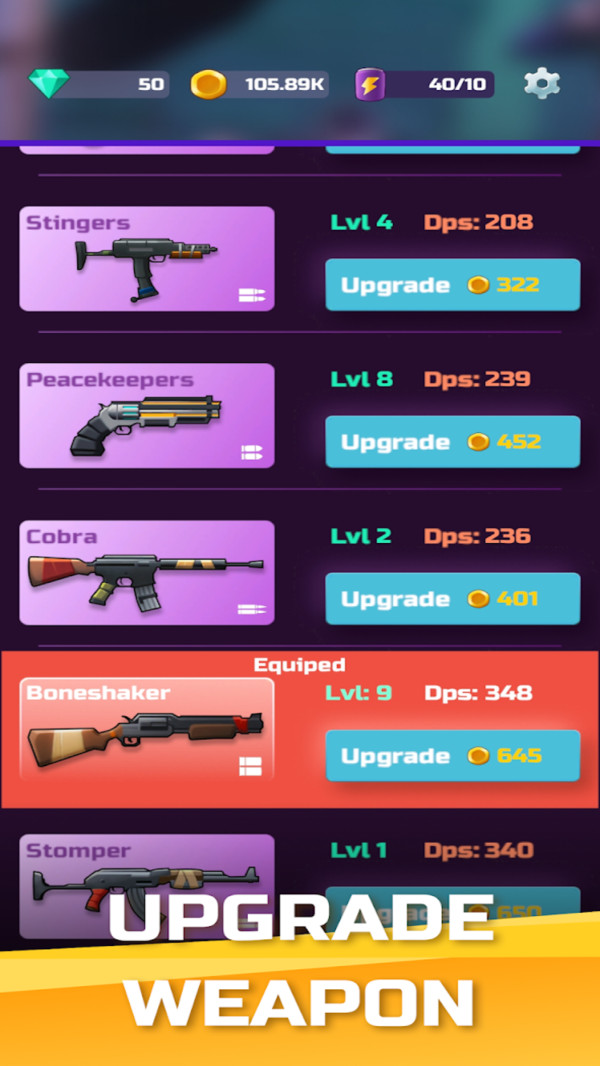 2、武器可以自由升级,金币可以增加自己的武器战斗力,让闯关变得更加轻松。