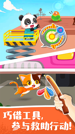 发现受伤小动物,宝宝救援小队快来帮忙!驾驶救援车,紧随地图上的动物图标,便能到达搜救地!听,有猫叫,原来是小猫被困在车身下!聪明的宝宝想想看,怎样才能使小猫不害怕地走出来呢?使用逗猫棒or电动鼠?