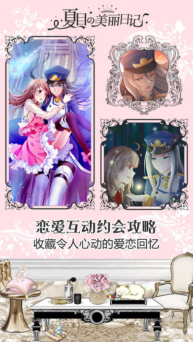 年度最高颜值穿越恋爱走心之作;百名顶尖画师、千张精美立绘、数万小时工期呕心之作;打破传统换装养成类手游玩法良心之作。夏目的美丽日记集换装、养成、恋爱于一体。百变DIY妆容、千套精装,万种搭配风格,更有宫廷风、宴会风、古装、星座等风格套装闪耀登场!傲娇少年、大叔暖男、霸道总裁等各类男神满足女生所有异性幻想;打破传统单向恋爱任务,独创互动恋爱玩法,游戏男主不仅可以和玩家对话更会不定时发送约会邀请;恋爱中的他们贴心又会吃醋,是男神也秒变能男神经。