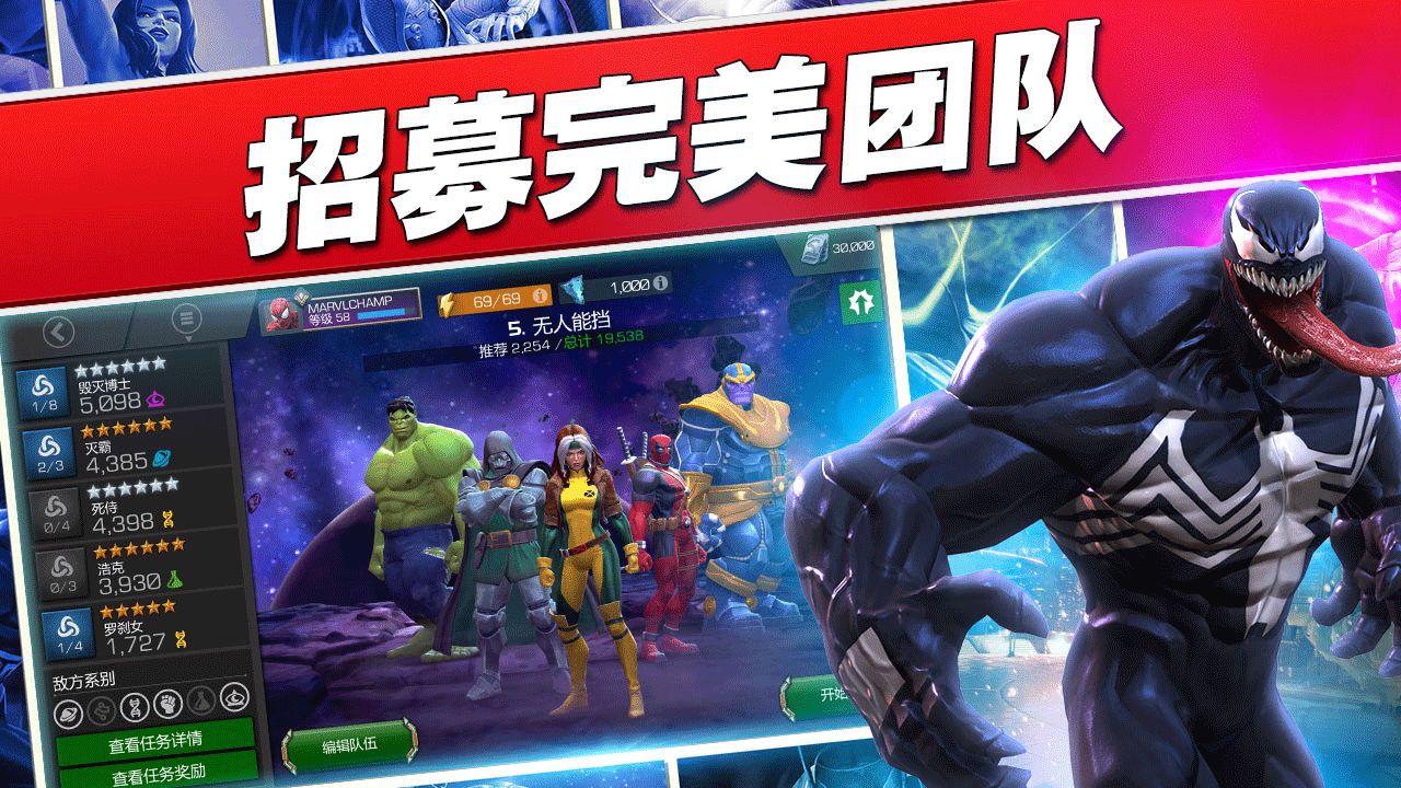 3、收集,升级,并根据漫威漫画情节中的人物关系,妥善地安排队伍中的英雄和反派成员来获得队友加成