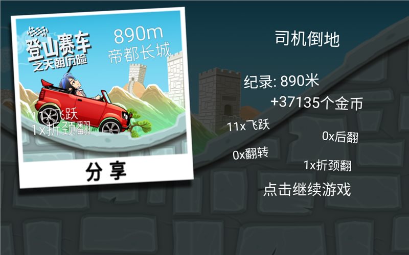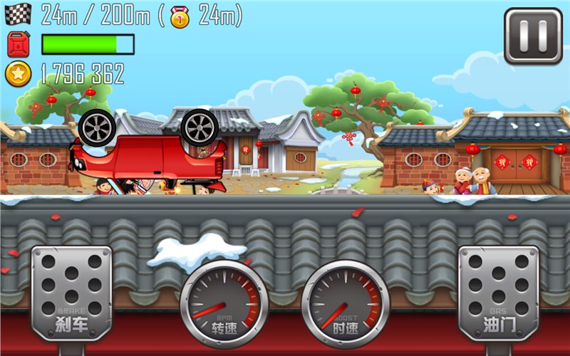 1、要想得到高分,初期我们要控制好车速,保持车子的平衡,下坡的时候车速太快要刹车,上坡的时候要踩点油门提速。只有控制好车子平稳的在跑到上跑,你才能跑的更远,获得更高的分数,所以看起来简单的操作,其实并不是那么的容易。