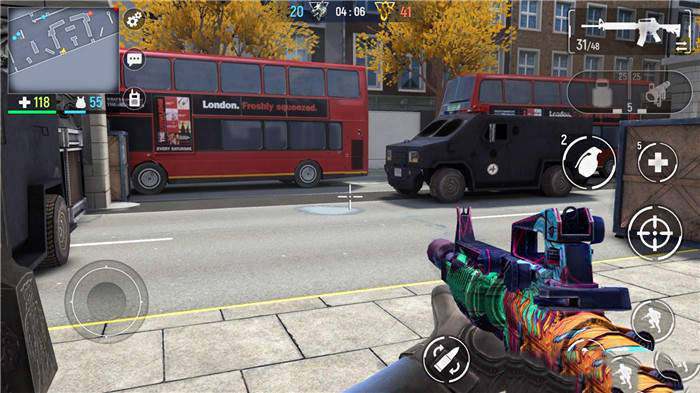 4、现代行动中直观的控制和简单的界面、滑动、瞄准和射击。