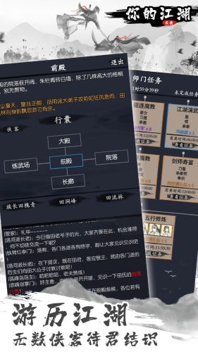 你的江湖免费下载是一款探索文字武侠游戏。它结合了策略和剧情元素,让玩家更自由地探索游戏世界。游戏中玩家需要通过与NPC互动、解开谜题、参与战斗来获取信息、提升实力,带玩家带来武侠江湖世界的精彩。超级简单的操作,使得玩家可以深入体验武侠世界的种种风情,还提供更多闯荡内容,同时提供六大门派供玩家选择,再现了武侠江湖中的恩怨情仇。采用顶尖游戏引擎打造,带给玩家最极致的视听体验。如果你是一个对游戏要求很高的玩家,不妨来试一试这款游戏,相信他一定不会让你失望。