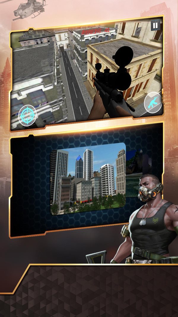 在这款狙击任务游戏中玩家将是特种部队的精英狙击手,玩家肩负了拯救城市的重任,使用自己的狙击枪击杀敌人和罪犯,而且狙击枪种类丰富多彩,玩家可以体验各种各样的枪支带来的击杀体验。暗杀敌人的时候,不可以小心大意,需要沉着冷静调整瞄准镜,瞄准狙击目标,再扣动扳机一发致死。可以说是非常的惊心动魄了,再搭配上惊心动魄的3D图形和声音效果,令玩家身临其境般地体验狙击时刻。