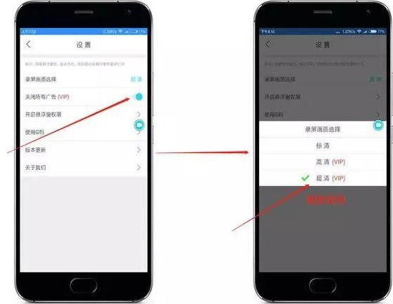 2、进入软件的【设置】界面,可以看到我已经开启了会员功能的【关闭所有广告】,还有这里我点击【录屏画质选择】;这里可以看到“高清模式”和“超清”模式都是需要vip才能开启,但是这些我们都可以随意使用。