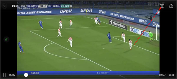 3、随意在手机上使用爱奇艺体育app点开一个视频,在全屏播放模式下右上角会有一个“TV”放入标志,点击便可以进行投屏服务。刚开始可能会出现投屏失败的情况,多试一次就可以了。