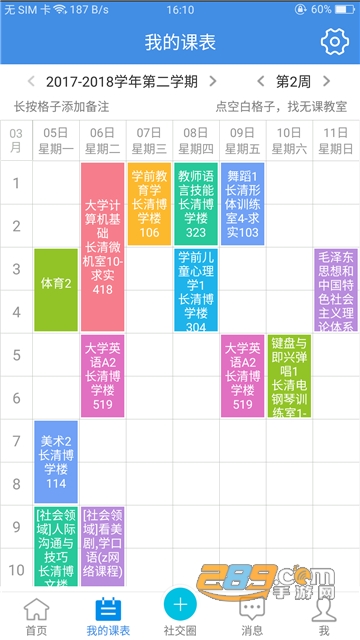 1、课表,选择时间查看课表安排,长按格子即可进行备注,单击空白格即可查看空闲教室;