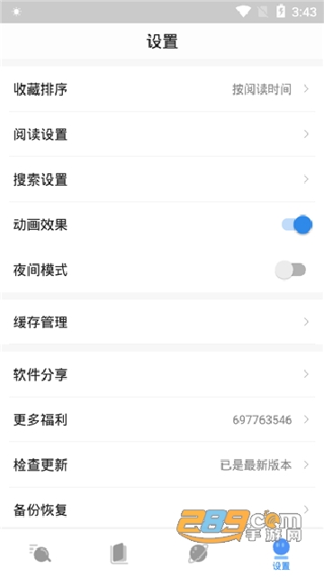 设置:收藏排序、夜间模式、阅读设置、缓存管理、检查更新等功能都在这