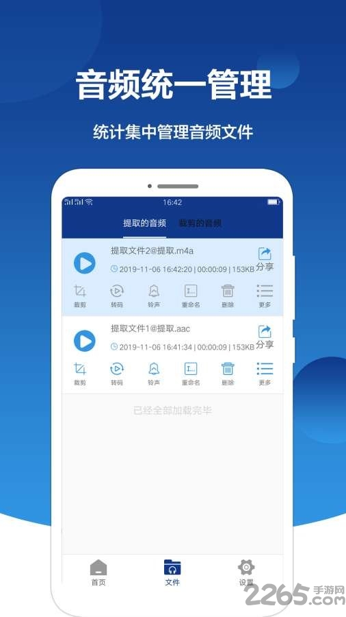 音频提取大师对提取的音频文件和裁剪出的音频文件进行分类并进行统一管理,让音频文件不再杂乱