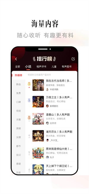 喜马拉雅听书app内容也十分全面,包含了新闻谈话、有声小说、政党园地、综艺节目等内容,无论你喜欢什么节目,都可以在这里找到属于自己的快乐。