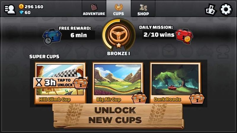 登山赛车2中,游戏分冒险模式和杯赛模式。玩家在冒险模式的地图中达到游戏要求即可解锁杯赛模式中相应的地图关卡。在杯赛模式中,玩家会随机匹配到3位玩家展开竞技,获得胜利将赢取丰厚的奖励。