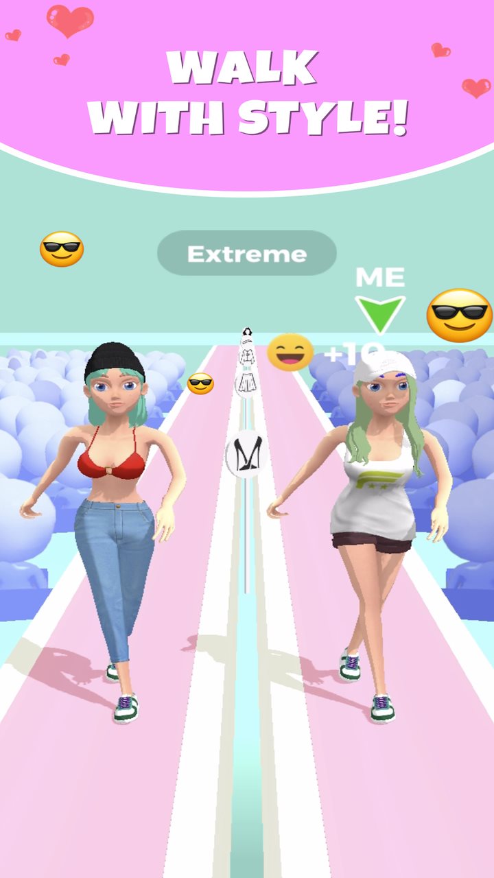 这是一款非常有趣的魔性跑酷小游戏,在游戏中还可以学会穿搭,各种不同的服装配上不同的主题,在走秀台上拾取到的服装会立刻换上,根据主题评分打败对手。