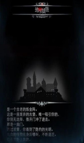 《地下城堡》使用了地下城风格的背景故事:世界忽然陷入无边的黑暗,玩家在旷野中疯狂逃跑以躲避嗜血怪物的追杀。最后玩家在一座废弃的古堡里发现一个古老的炼金阵,并决定借助古代魔法的力量在黑暗世界中生存下去,当然还有探寻噩梦的真相。作为一款文字探险游戏,玩家最多可以在三个进度间自由切换。具体玩法上,玩家要通过炼金术来积累金币资源,然后用金币招募各种工匠,让他们扩充地下城的各种建筑。在有了提供各类资源的建筑后,玩家要招募探险队,去探索被黑暗笼罩的危险荒野。游戏中涉及的建筑包括民宅、农场、商店、马厩、磨坊、酒馆、训练营等,在合理分配工匠资源后,荒野探险所需的面包会被源源不断的制作出来,在你命令探险队出发后,游戏将进入第二个阶段。目前《地下城堡》中一共有10个巨大的迷宫等待玩家探索,每张地图上都包含传送点、探险地点等,有些探险点可能有一段剧情等着你,有些在肃清低级敌人后可以作为资源采集点,有些则有强力的怪物等着玩家。在通过各种手段积累资源后,玩家可以将普通的冒险者训练成战士、弓箭手、牧师、巫师等职业,更多高级别职业冒险者的加入会扩大你的探索地域。除此以外游戏中还有各式各样的突发事件等待玩家决断,再加上有两个官方扩展包等待玩家购买和探索,笔者已经无法估计通关所需要的游戏时间了,总之这是一场真正值得一试的地下城冒险。