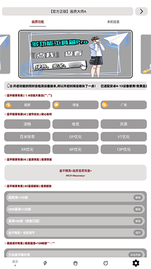 画质大师A2024是一款专为游戏爱好者打造的画质优化工具,这款软件支持和平精英、吃鸡pubg、香肠派对、黎明觉醒等超多热门的手游,能够帮助用户提升游戏原本的画质,让用户能够收获更加舒适的视觉体验,并且游戏在提升画质之后还能保持游戏的流畅度,保障用户的游戏体验。