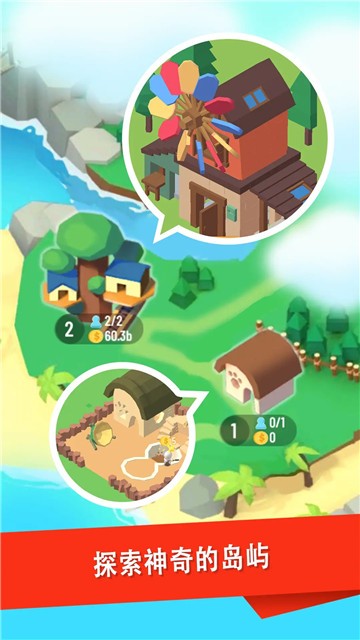 放置小岛是趣味休闲的模拟向游戏,玩家在游戏中可以通过各式各样的方式探索神奇的岛屿,战略性地合成各式各样的动物,不断扩大你的动物团队,同时升级、加快建设的速度,赚取更多金币,使你的动物更具吸引力。