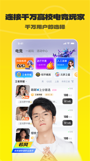 连接千万高校电竞玩家,汇聚众多电竞教练大神,一键找到悦耳声线、有趣又高超技术的导师,带你默契上分!寻找英雄联盟、王者荣耀、和平精英、永劫无间、绝地求生等电竞教练指导。
