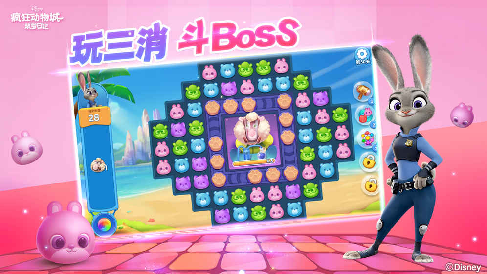 疯狂动物城筑梦日记是一款非常好玩的休闲益智消除游戏。游戏中我们将来到神奇的动物城冒险,这里有很多非常可爱的小动物。有些小动物会遇到麻烦,自己可以选择自己想要养殖的动物,将他们养大进行售卖,合理的经营这自己的小小得农场,最后一步步的壮大自己,打造自己的农场帝国。喜欢模拟经营的朋友快来下载这款有趣休闲的游戏吧。