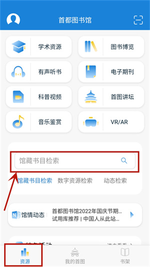 1、登录账号后,可以在资源栏进行馆藏书目检索,搜索想要阅读的书籍。