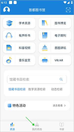 2、办理好后,打开并登入首都图书馆app,点击底部 "我的首图",
