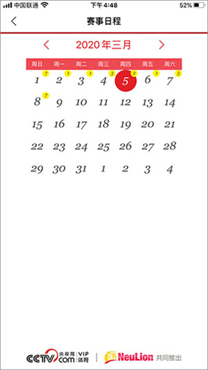 2、点击页面右上方日历图标,即可查看当天、当月以及往期的赛事节目单。