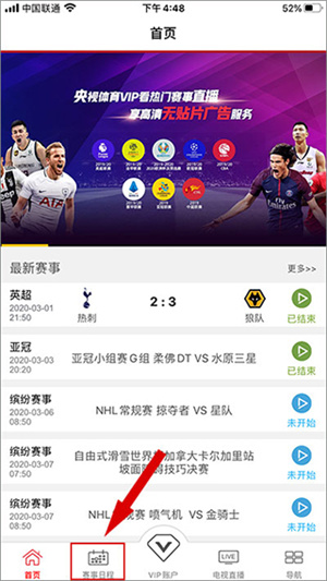 1、打开央视体育VIP移动客户端,依次点击“首页”-“最新赛事”-“更多”,进入赛事日程。