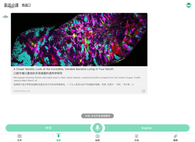 输入“看看”,小译会推荐知名网站精选的科普内容并翻译为双语对照模式,让你轻轻松松坐在家里学知识