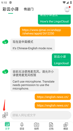4、除了翻译文字外,我们还可以点击底部的语音、拍照、文档、横屏按钮,使用其他翻译功能。