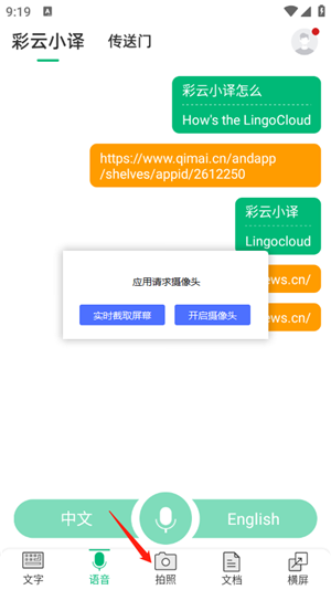 5、语言翻译为录入声音后进行翻译,拍照翻译为开启摄像头后进行拍照翻译或导入相册中的图片进行翻译,而文档则是上传文档进行翻译,横屏为对话翻译。