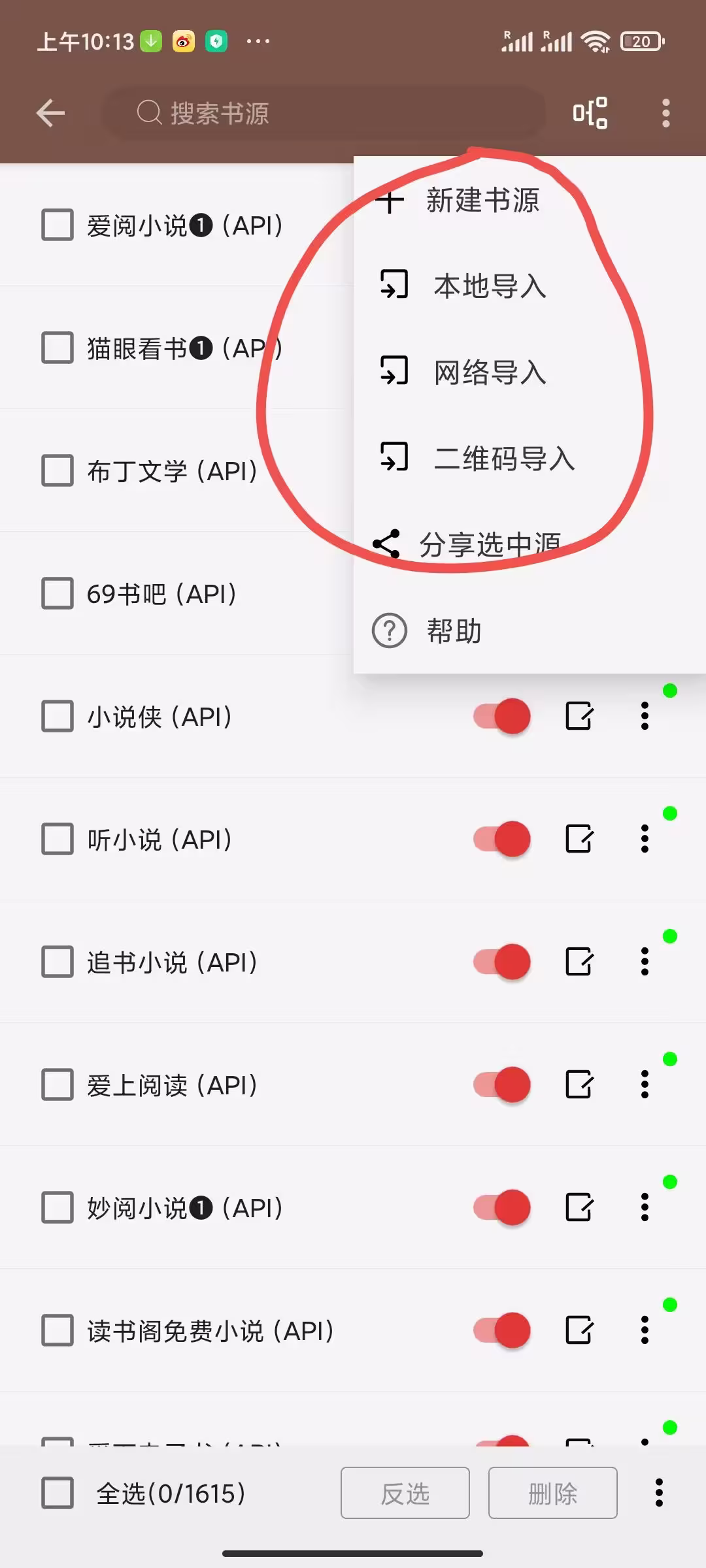 ②、根据书源格式,右上点网络(本地/扫码)导入,加载书源即可。
