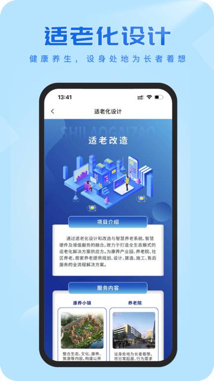 慈海养老是一款给用户提供了综合性服务的App,包含的服务类型非常的多,有购物,养老服务,健康管理,文化工艺以及旅居等,满足了广大用户的需求,会给老年人推出一些有意义的活动,丰富了老年人的生活,也可以购买到更多的优惠商品。