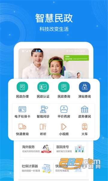 包含民政认证、民政查询、民政办理、津贴查询、政务信息、寻医问药、票务、快递查询等等便民服务。