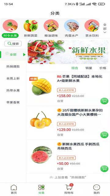 3、提供便捷的商品分类功能,根据自己的需求快速查找到所需的食材和商品,并进行下单购买。