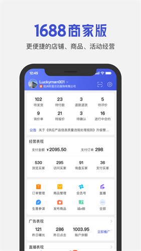 1688实时输入店铺内的物品信息,让顾客可以清楚地看到和理解店铺里的物品,开设管理课程,可以通过视频了解店面管理,可以随时在网上查询自己的店铺。
