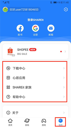 7、在我的界面,包括下载中心、心愿应用、SHAREit家族和帮助中心等选项,用户可根据需求选择使用,包括查看下载的文件和查看帮助,以上就是茄子快传的使用方法了。