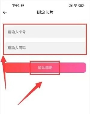 4、在绑定卡片页面,输入卡号、卡号密码,点击确认绑定按钮。