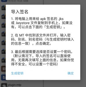 直接使用MT默认的签名密钥可能存在安全隐患,可以点击.jks或.keystore文件来导入已有的密钥,也可以生成新的密钥。