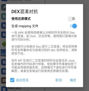 - APK 编辑功能,主要有 DEX 编辑,ARSC 编辑,XML 编辑,APK 签名、APK 优化、APK 共存、去除签名校验、RES 资源混淆、RES 反资源混淆、翻译模式等。